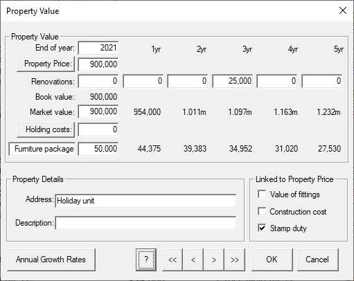 2. Property price: Click on the “Property value” row title with the left mouse button and the Property Value dialog will appear. Subtract 3 from the year shown. Change the property price to 900k, the furniture package to 50k and the renovations in year 3 (i.e. the end of year 3) to 25k. If you wish, you can specify the property address and description for later reference (these items would then appear on any reports that you generate from the spreadsheet). You can use the arrow keys to navigate from field to field or simply use the mouse to click on the appropriate field. Click on OK to return to the main spreadsheet with the changes you may have made in the dialog. Note that the property value will show $900,000 (not $950,000) as the “property value” normally includes fixtures and fittings but excludes furniture.