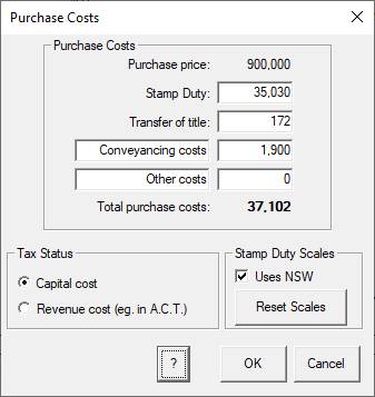 1. Purchase costs: Click on the “Purchase costs” row title and the Purchase Costs dialog will appear. Change the conveyancing costs to $1900 and ensure that the spreadsheet is using the current New South Wales scales to calculate stamp duty (if necessary, click on the Reset Scales button to change them) and title transfer fees. Click OK to return to the spreadsheet.
