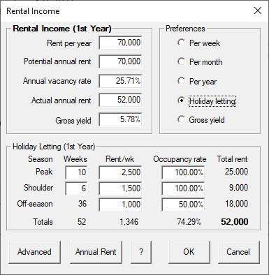 1. Rent: Click on the “Gross rent /week” row title and the Rent dialog will appear. Choose the “Holiday Letting” option and note that the seasonal rent template will be activated. Specify the seasonal duration, rents and occupancy rates as specified above and click OK to return to the main spreadsheet. Now the problem we encounter here is that the seasonal rents we specified pertain to year 4 whereas the dialog pertains to year 1. To fix this replace the amount showing in year 4 on the main spreadsheet with the amount given in year 1 ($52,000). The rental guarantee for year 1 to 3 is for a net rent of $36,000. The simplest way to simulate this is to directly insert $36,000 in the rent cells for years 1 to 3 and set the corresponding years’ expenses to zero.
