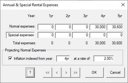 1. Expenses: Click on the “Rental expenses” row title to bring up the Rental expenses dialog. Click on the button “Annual and Special Expenses” and change the expenses in year 4 to 30,000. Then change the numbers in years 1 to 3 to zero and click OK to return to the main spreadsheet.