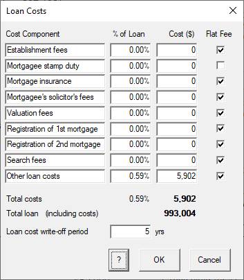 2. Loan: Click on the “Loan amount” row title to bring up the Loan Amount dialog. Note that there are no cash outlays and that the total loan reflects the total of all costs associated with acquiring the property. Click on the Loan Costs button to bring up the Loan Costs dialog and simply make all values except “Other loan costs” zero. Change Other loan costs to $5,902 and hit the Enter key.