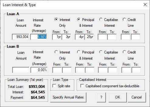 1. Click on the OK button to return to the Loan dialog with the updated loan costs and note the change to the loan amount. While still in the Loan dialog, click on the Loan Type button to bring up the Loan Interest & Type dialog. Choose Interest Only loan type and change the term from 40 years to 3 years and the interest rate to 6.5%. Note that Principal & Interest is assumed for the next 25 years. Change this to read from year 4 to year 25.