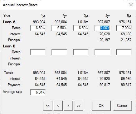 1. To correctly specify the interest rate for the later years, click on the “Annual Rates” button and change the rate for year 4 to 7%. The change will be projected forward for all later years.