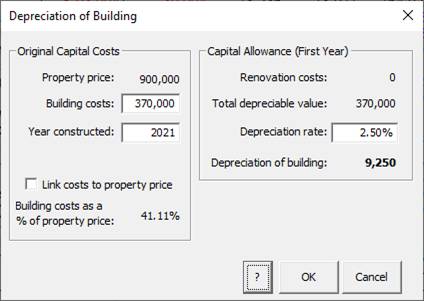 2. Building depreciation: Click on the “Deprec. of building” row title to bring up the dialog. Change the building costs to 370k and hit the Enter key. Note that, by default, any building depreciation claimed as a tax deduction will be taken into account in calculating any capital gains tax liability if the property were to be sold. Click OK to return to the main spreadsheet.