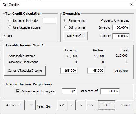 1. Tax credits: Click on the “Tax credits” row title to bring up the dialog and change the investor’s taxable income to 165k and the partner’s taxable income to $45k. Note that the method for tax credit calculation will be using taxable income rather than simply assuming that all tax credits accrue at the specified marginal rate. Choose “property in joint names” and click OK to return to the main spreadsheet. Note that the row title will have changed to “Tax credit (joint)” and the input column will show $205,000 (i.e. 165,000 + 45,000).
