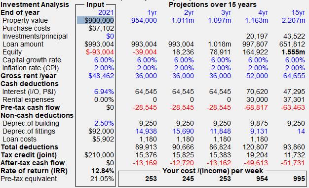 The estimated after-tax internal rate of return should show 12.84% (This assumes the tax credits are calculated using the 2024/25 Australian tax scales). Their contribution in the fourth year jumps to $47,845 (about $920 per week), having been around $250 per week for the first three years. The main reason for the jump is not the rental guarantee expiring but rather the increased loan (renovations) and the switch to a principal and interest loan, with significant principal payments ($19,701 in year 4) that now have to be made. The equity built up in the property after fifteen years is estimated to be $1.521 million.