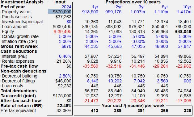 an Investment Property Value of $870,000 (as set in the Investment Analysis