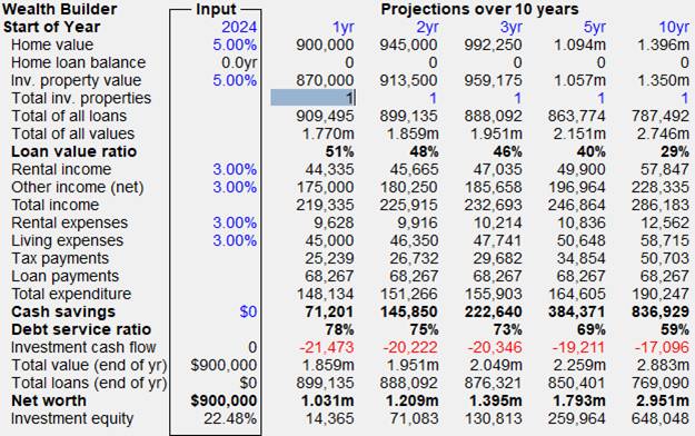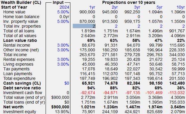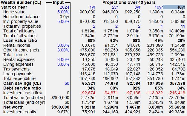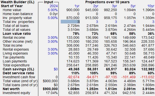 A short cut to this end is to use the Maximise Wealth Builder item under the Investor menu. In this process, you will be asked to specify the constraints on cash savings, Loan Value ratio and Debt Service ratio. This will do the calculations right up to 40 years, by which time you would finish up with 11 investment properties.