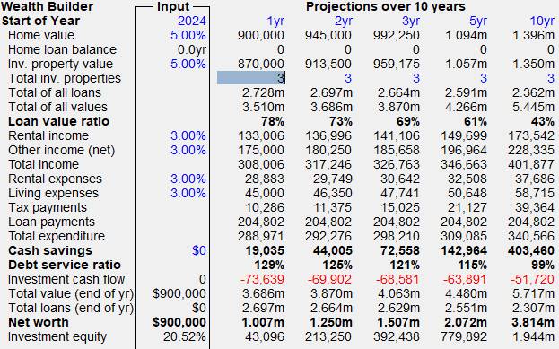 Lets now check some of the key parameters to see if the number of properties showing in the Wealth Builder in the 1st year column - Total inv. properties row and the number of properties calculated previously in the Investment Capacity correspond in the first year. Lets start with the number of properties set to 3.